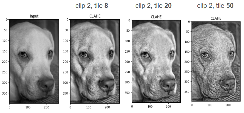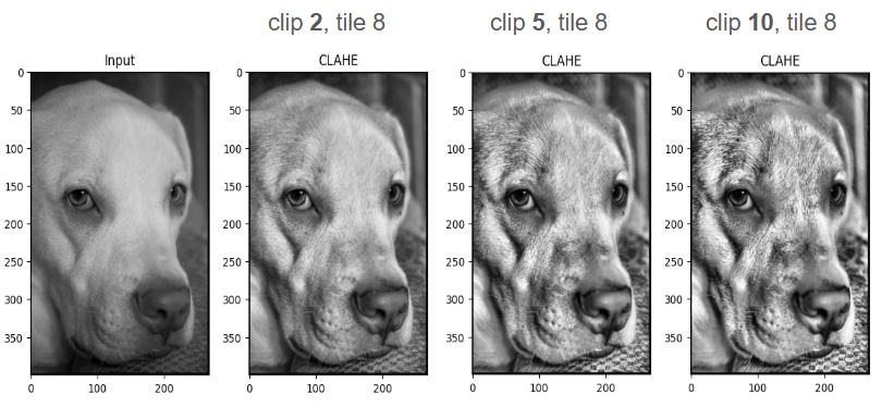 - clipLimit(대비 제한 임계값) : 값이 클수록 국소 대비가 크게 증폭되어 노이즈가 늘어날 수 있음, 2–5 범위 권장
